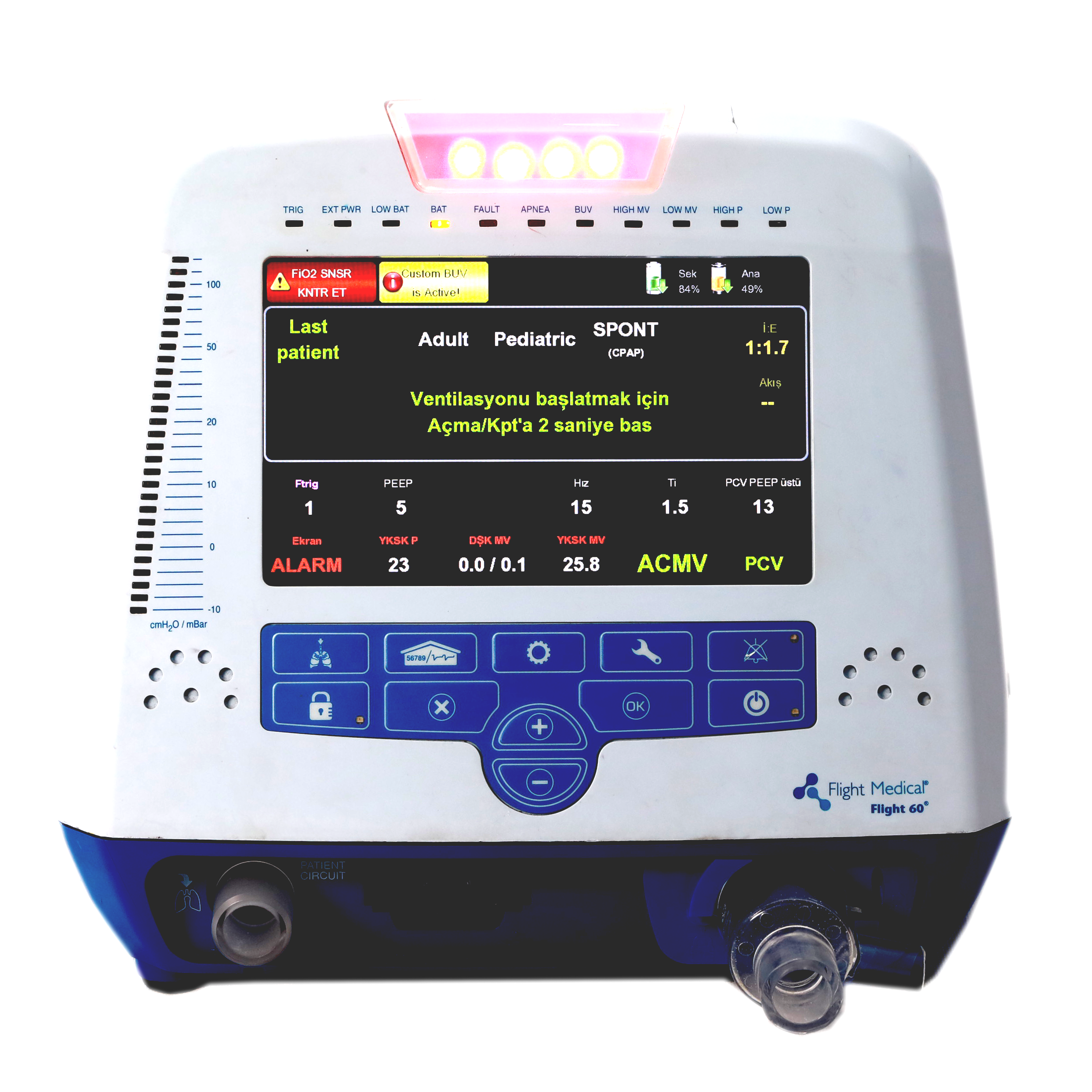 - ACMV, SIMV, SPONT, BiLEVEL ve Volume Garanti (VG) Ventilasyon modları