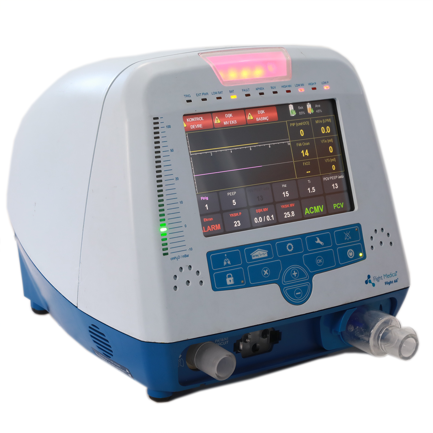 - Tidal volume 30 – 2200 ml, Frekans 1 – 99 bpm